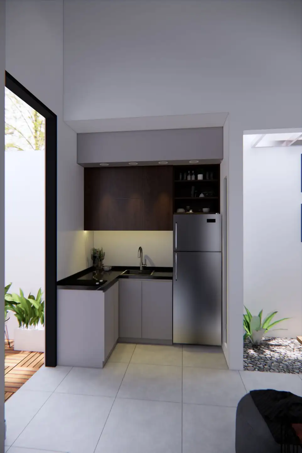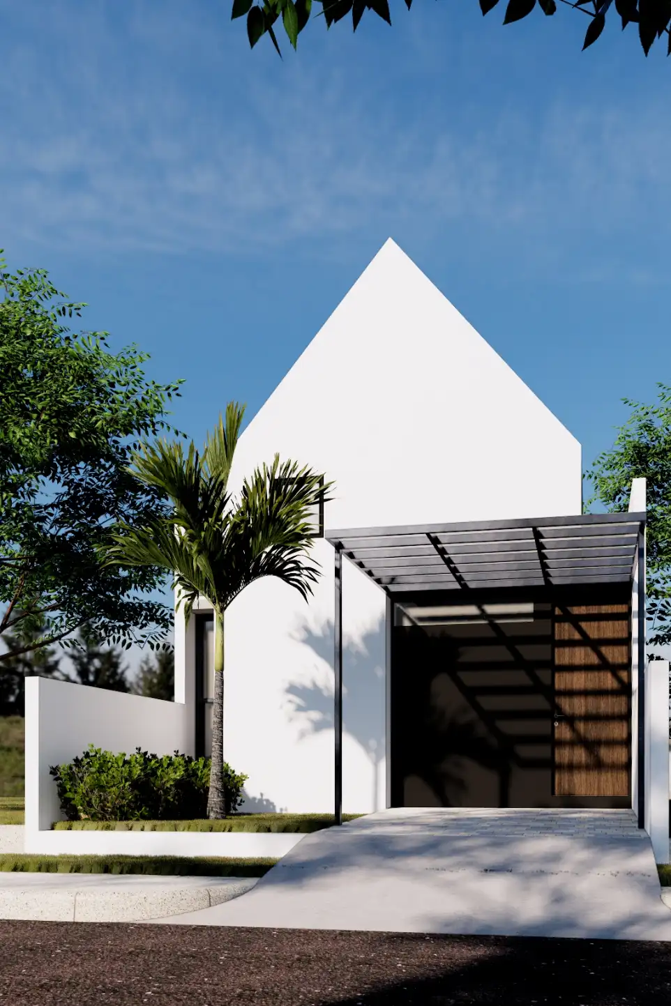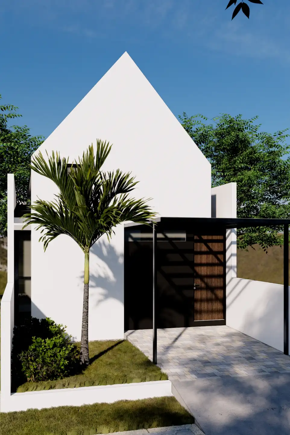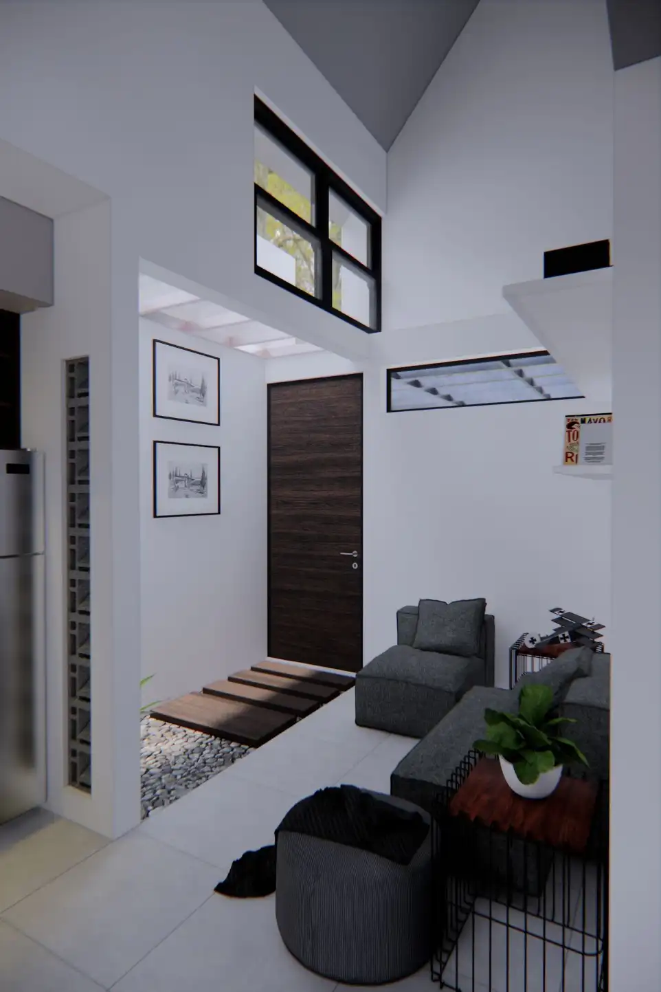 Rumah 6 x 11 meter ini mengusung konsep modern minimalis dengan bentuk atap pelana sederhana yang bersih dan tegas. Tampilan fasadnya tampil solid dan elegan, dipadukan dengan carport ringan berstruktur besi serta permainan material kayu pada pintu utama yang memberi sentuhan hangat. Meski berada di lahan kecil, komposisi massa dan bukaan dirancang agar tetap terasa lapang dan terang, menjadikannya hunian kompak yang tetap berkarakter.