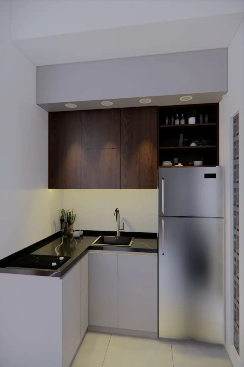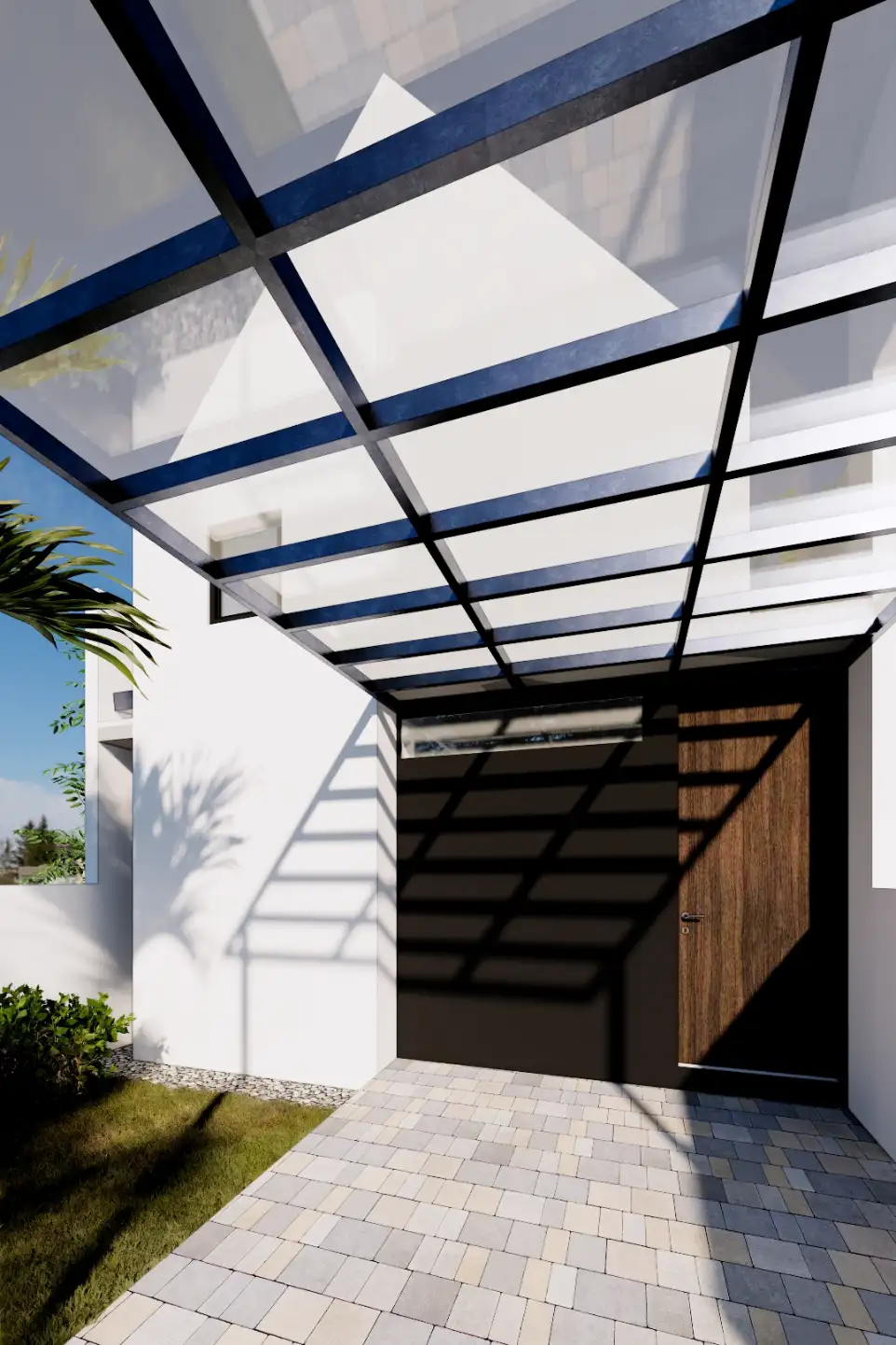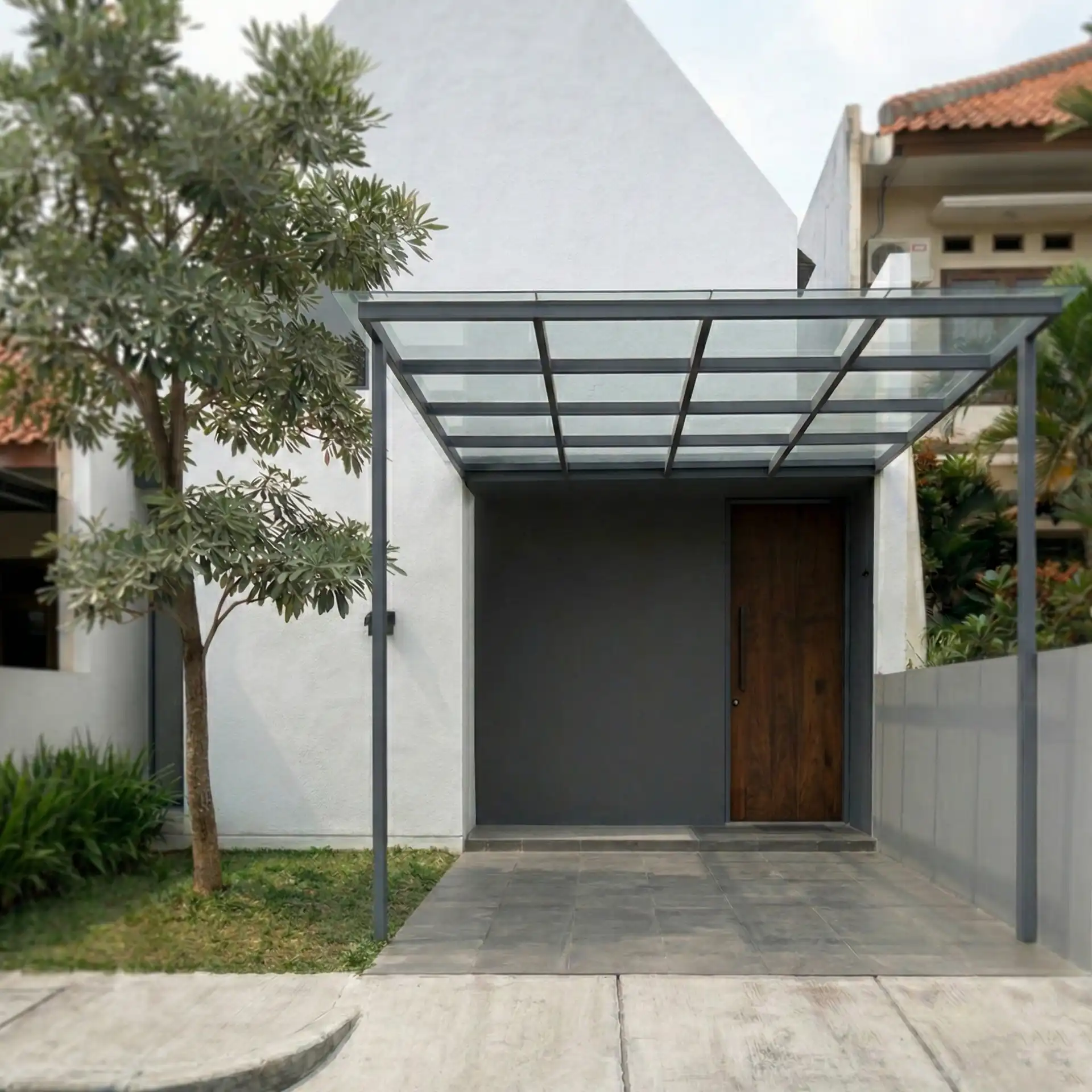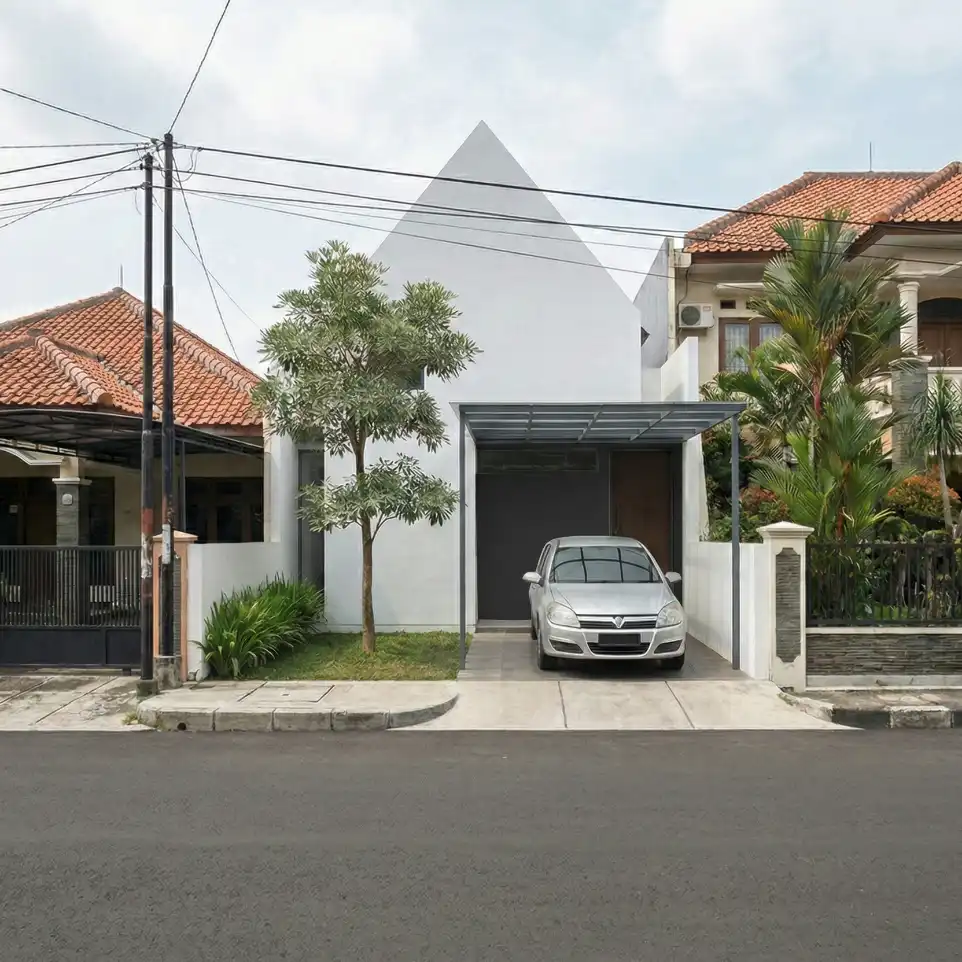 Rumah 6 x 11 meter ini mengusung konsep modern minimalis dengan bentuk atap pelana sederhana yang bersih dan tegas. Tampilan fasadnya tampil solid dan elegan, dipadukan dengan carport ringan berstruktur besi serta permainan material kayu pada pintu utama yang memberi sentuhan hangat. Meski berada di lahan kecil, komposisi massa dan bukaan dirancang agar tetap terasa lapang dan terang, menjadikannya hunian kompak yang tetap berkarakter.