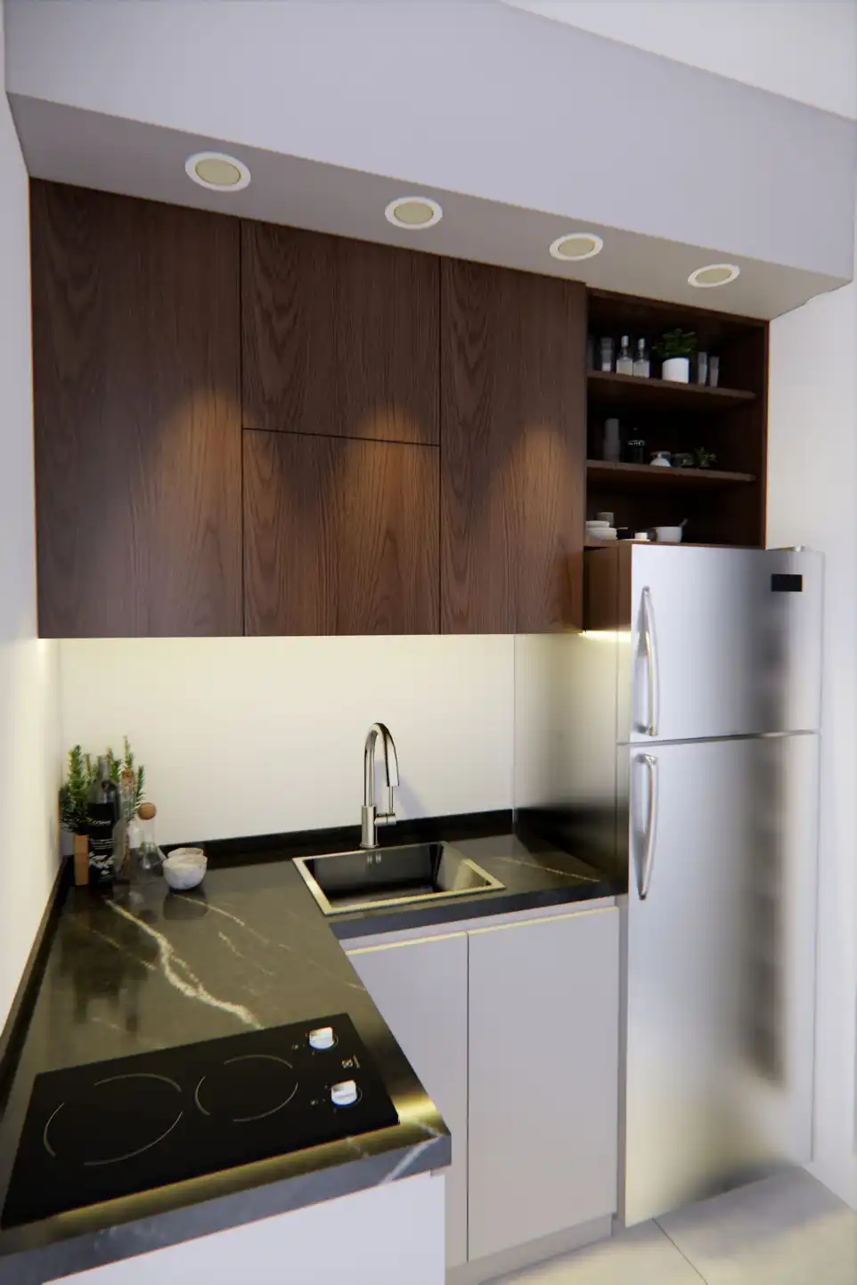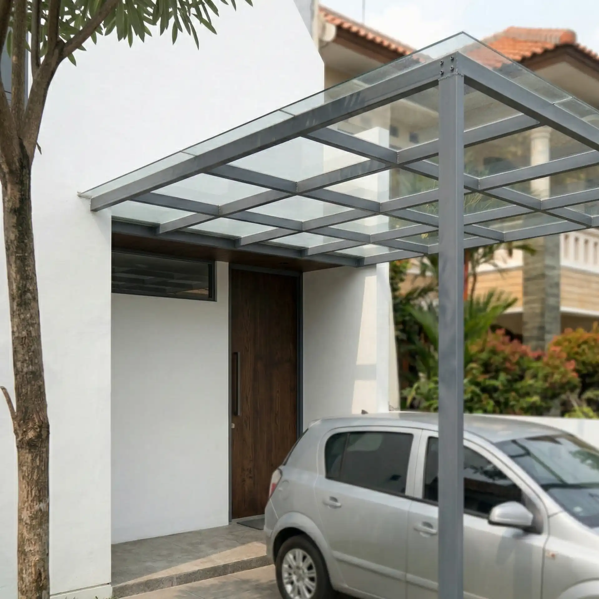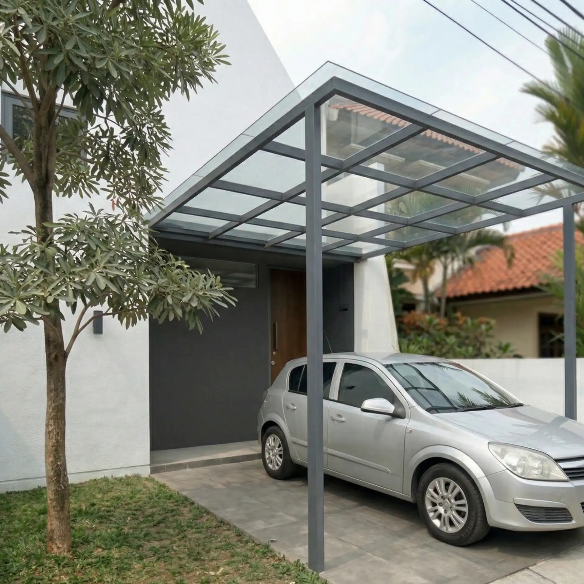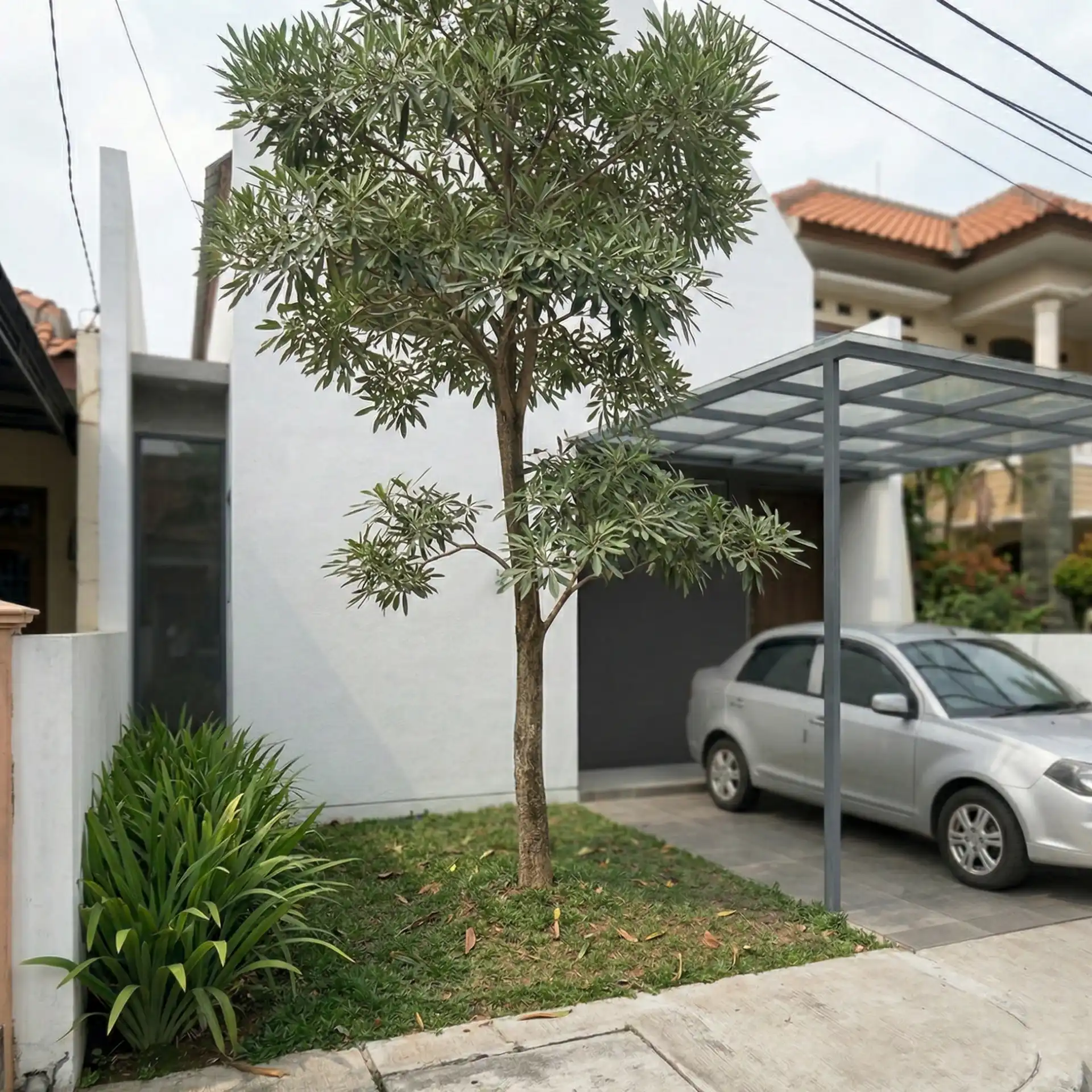 Rumah 6 x 11 meter ini mengusung konsep modern minimalis dengan bentuk atap pelana sederhana yang bersih dan tegas. Tampilan fasadnya tampil solid dan elegan, dipadukan dengan carport ringan berstruktur besi serta permainan material kayu pada pintu utama yang memberi sentuhan hangat. Meski berada di lahan kecil, komposisi massa dan bukaan dirancang agar tetap terasa lapang dan terang, menjadikannya hunian kompak yang tetap berkarakter.