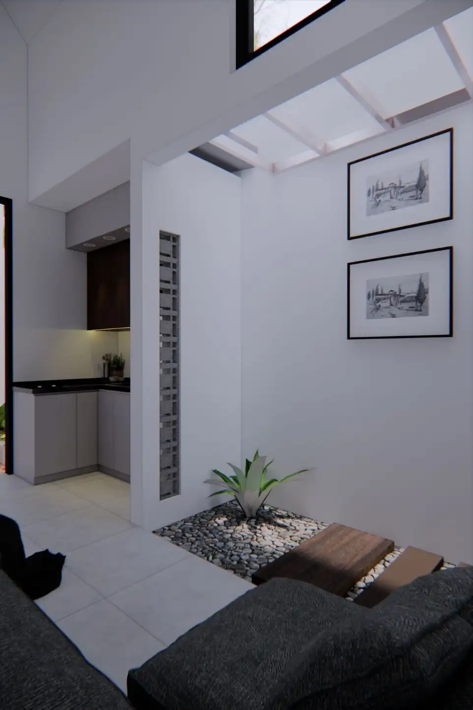 Secara tata ruang, rumah dua lantai ini memuat 2 kamar tidur, ruang tamu, area makan, area bersama, serta taman belakang dalam susunan yang efisien dan fungsional. Area bersama di lantai atas memberikan fleksibilitas aktivitas keluarga, sementara kehadiran taman membantu pencahayaan dan sirkulasi alami. Desain ini menawarkan solusi hunian sederhana namun tetap optimal untuk keluarga kecil yang menginginkan rumah modern di lahan terbatas.
