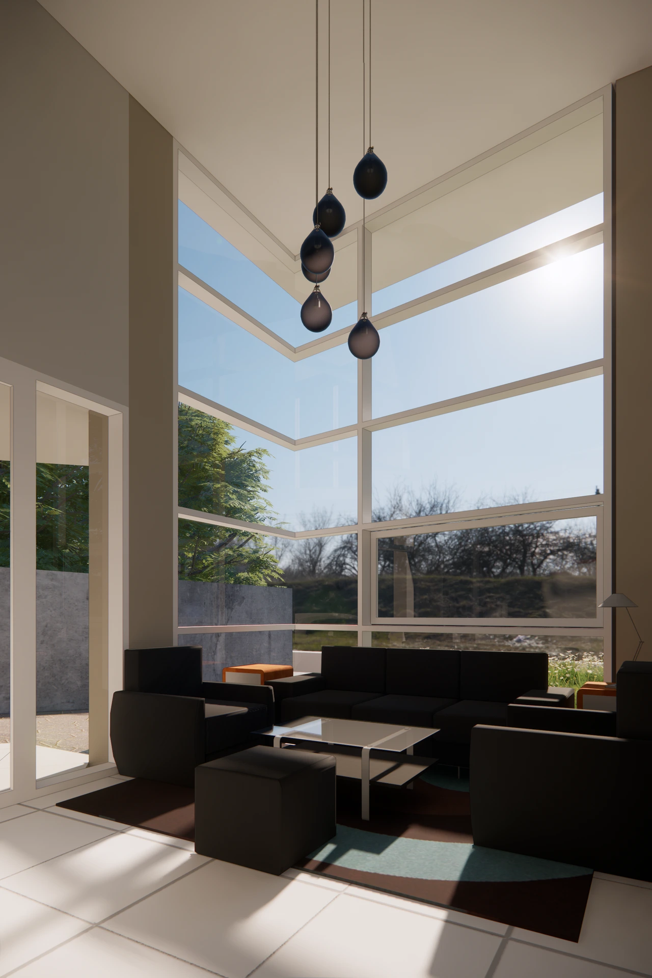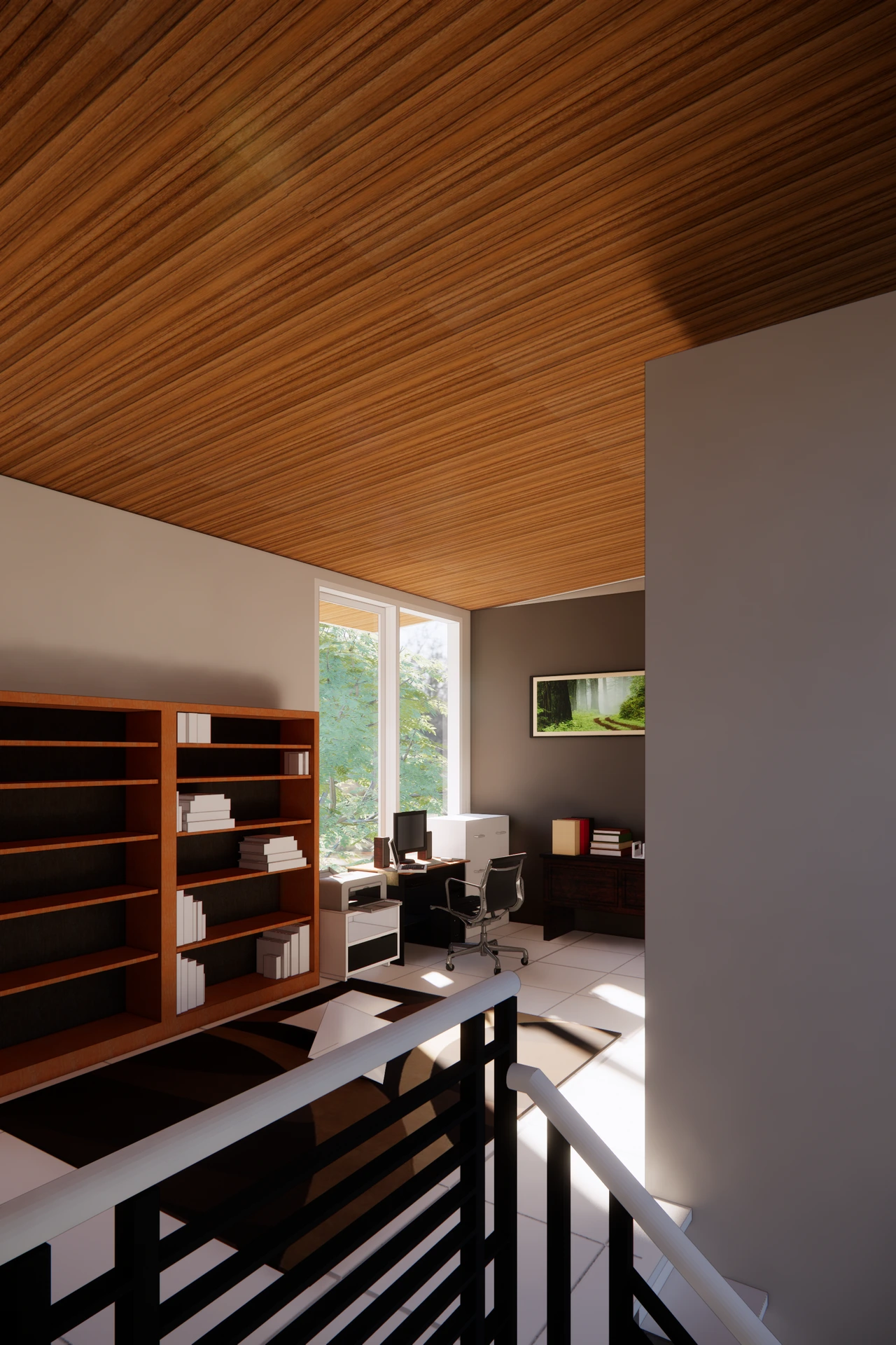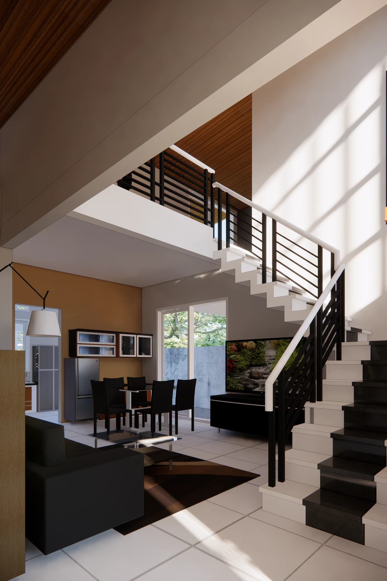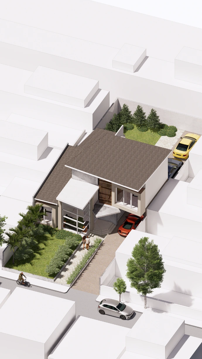 Secara tata ruang, hunian ini menghadirkan 2 kamar tidur, 2 toilet, ruang tamu, ruang keluarga, dapur, area makan, area kerja, area sholat, hingga area multifungsi dengan carport luas. Layout dua lantai dirancang terbuka dan terang, memaksimalkan pencahayaan alami serta koneksi visual antar ruang. Rumah ini cocok untuk keluarga yang menginginkan hunian modern yang representatif, nyaman, dan tetap memiliki fleksibilitas ruang untuk berbagai kebutuhan.