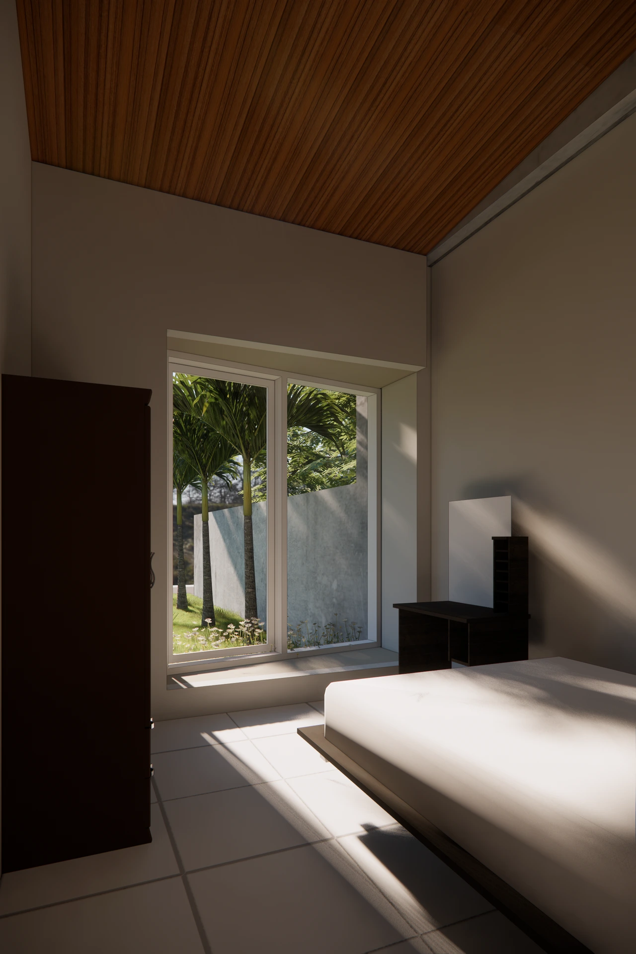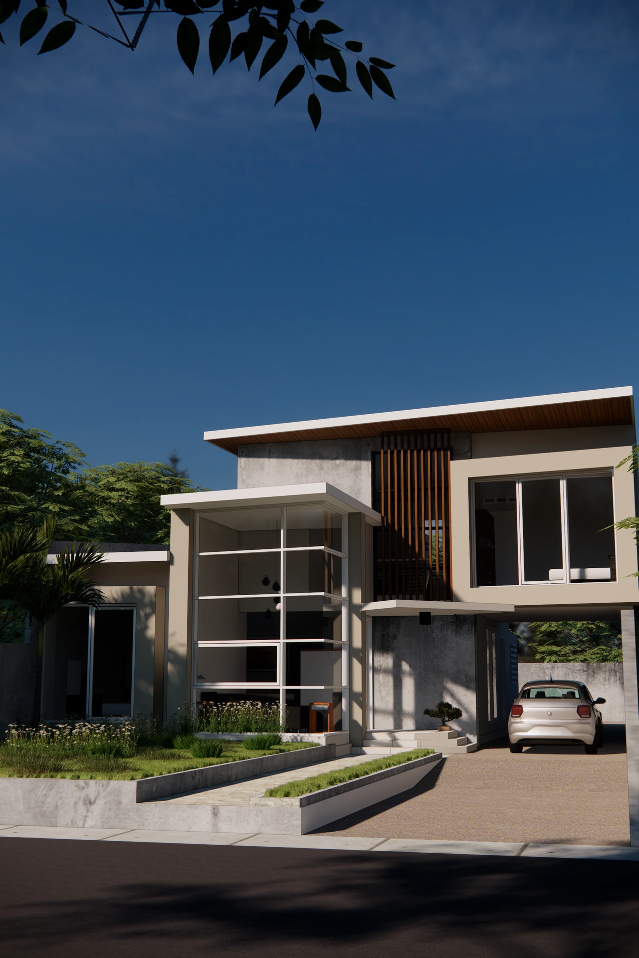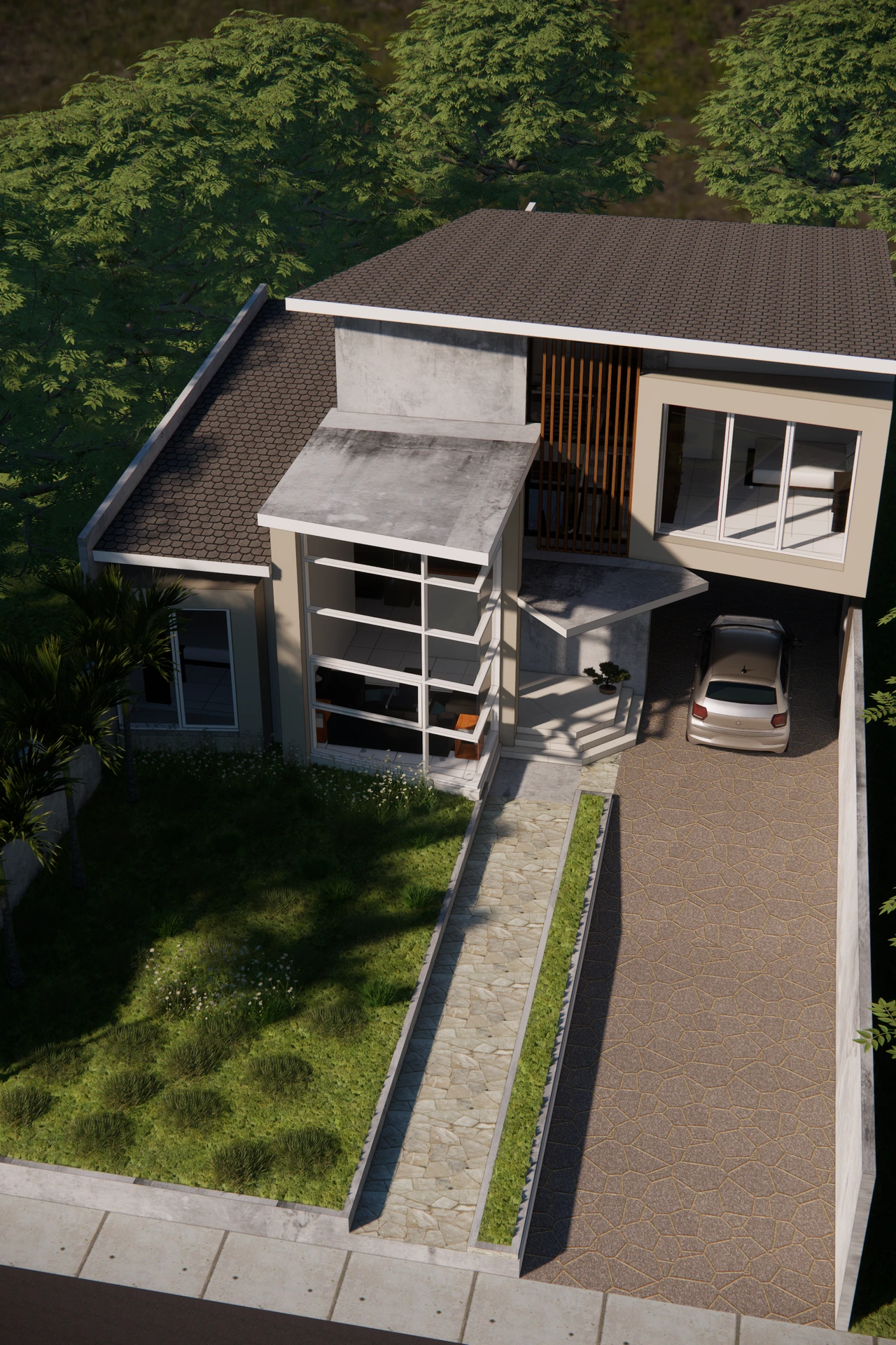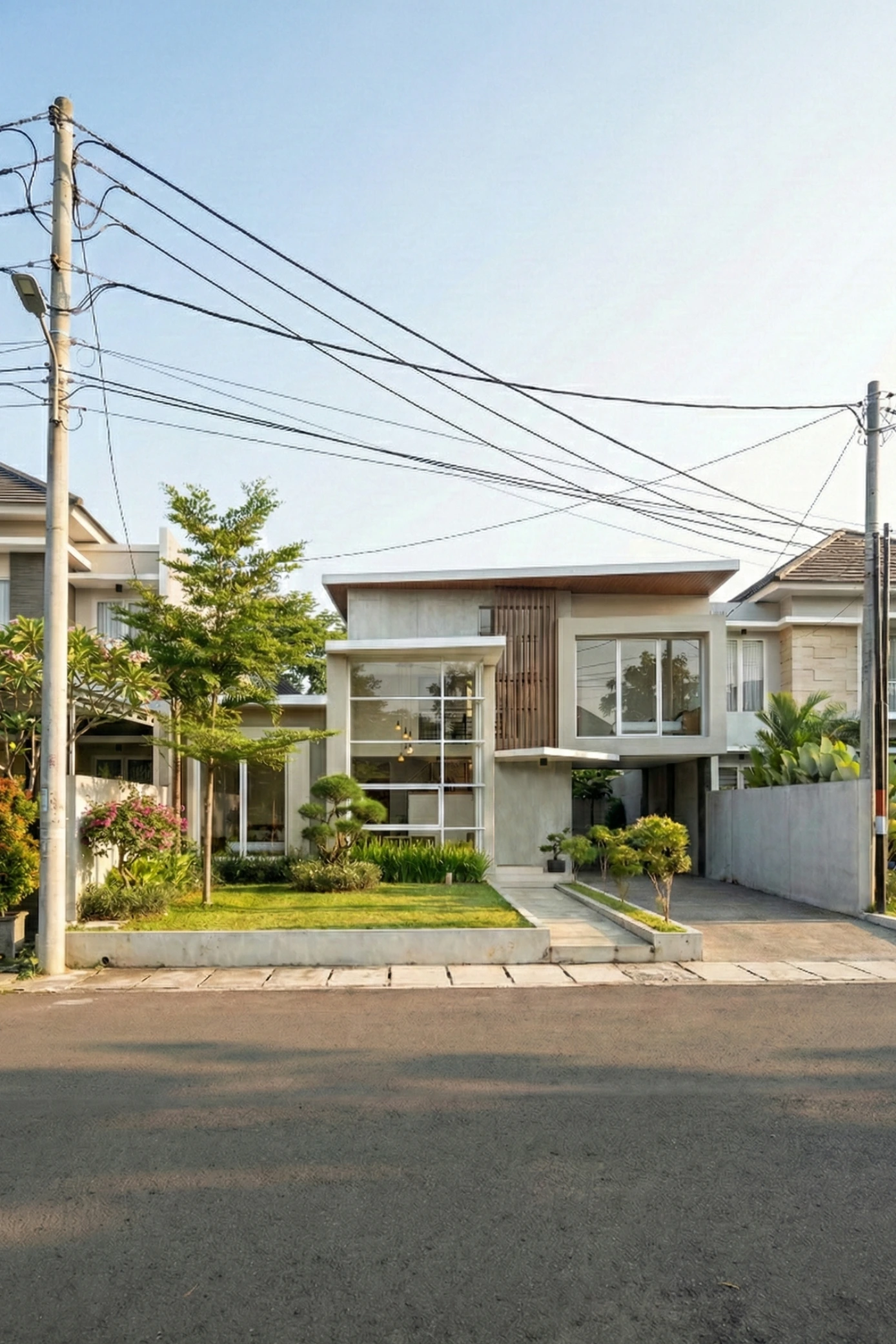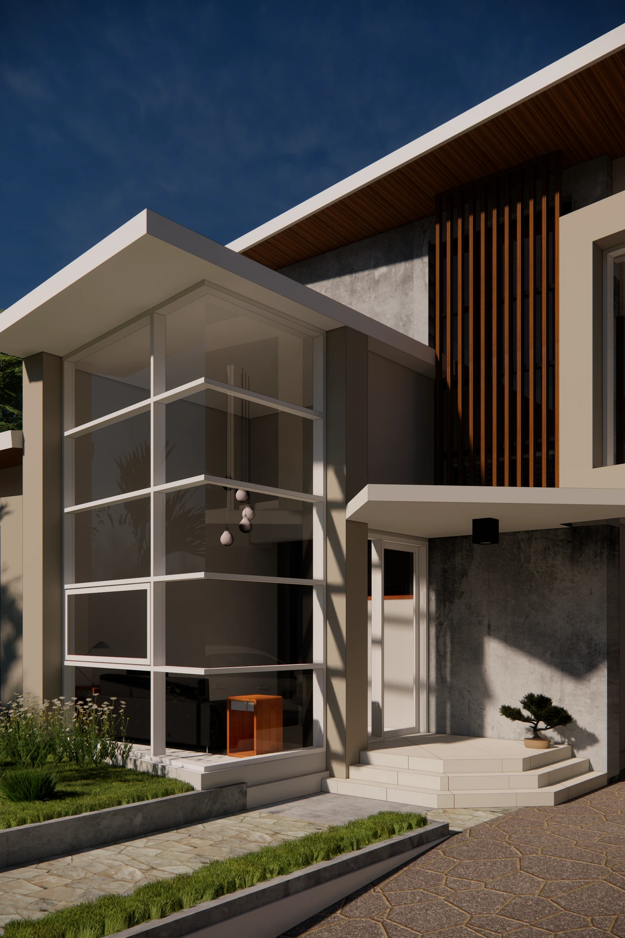 Rumah 15 x 18 meter ini dirancang dengan konsep modern kontemporer yang menonjolkan garis horizontal tegas, permainan volume, dan fasad kaca lebar yang elegan. Kombinasi elemen acian, secondary skin kayu vertikal, serta bukaan besar menciptakan tampilan yang kokoh namun tetap hangat dan berkelas. Komposisi massa bangunan dibuat padat di atas lahan luas, memberikan kesan eksklusif sekaligus fungsional.